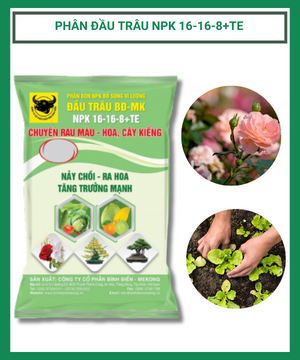 Phân bón đầu trâu NPK 16-16-8+TE là sản phẩm đến từ Công ty cổ phần Bình Điền – Mê Kông, chuyên cho rau màu, hoa cây kiểng.